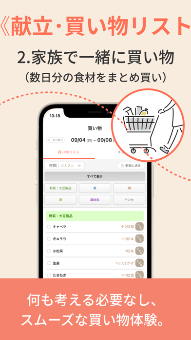 買い物リストに、献立を作るのに必要な食材が自動で書かれます。家に足りないものがあれば、買い物に行って補充しましょう。リストを家族に送って、買い物を頼むこともできます。