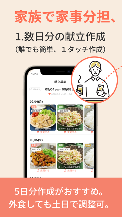 日付を選択すると1週間分の献立を自動で作成してくれます。アプリ開始時に好きな食べ物やアレルギー、家族構成を入力すると、それに沿ったメニューを表示。できあがった献立を入れ替えて、アレンジすることも可能です。