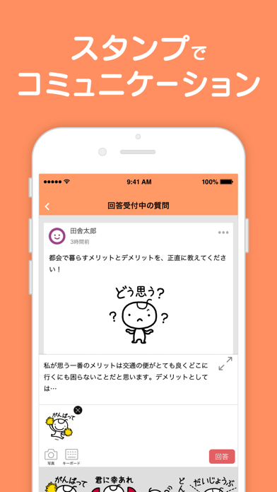 投稿に特別な条件は無く、悩み事を書き、カテゴリを選択するだけ。回答者を絞り込みたい場合は「特に答えてほしい方」を指定できます。またスタンプ機能があり、「マジレス希望」「パニック」など感情を表現することも。悩みの深刻さをユーザーにアピールできます。