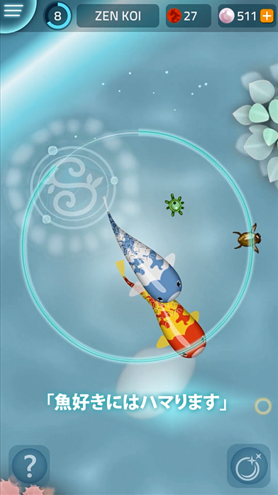 ▲鯉を操作して、小魚やプランクトンを食べさせてあげましょう。エサを食べ続けるとレベルアップし、鯉が大きくなります。