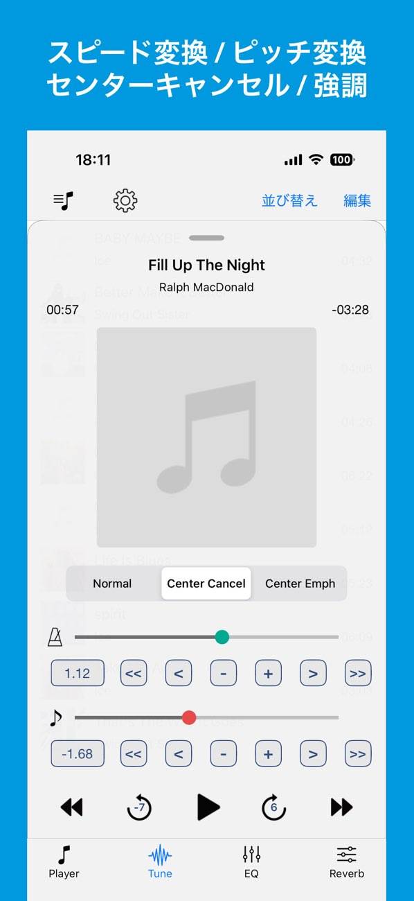 楽曲の速度とピッチを、それぞれ個別に変更できるプレーヤーアプリ。速度を変えても音程はそのままなので、聞き苦しさがなく、また音程をしっかり聴きたいときにも便利です。ボーカル音声も消せるため、耳コピの際に活躍してくれるでしょう。