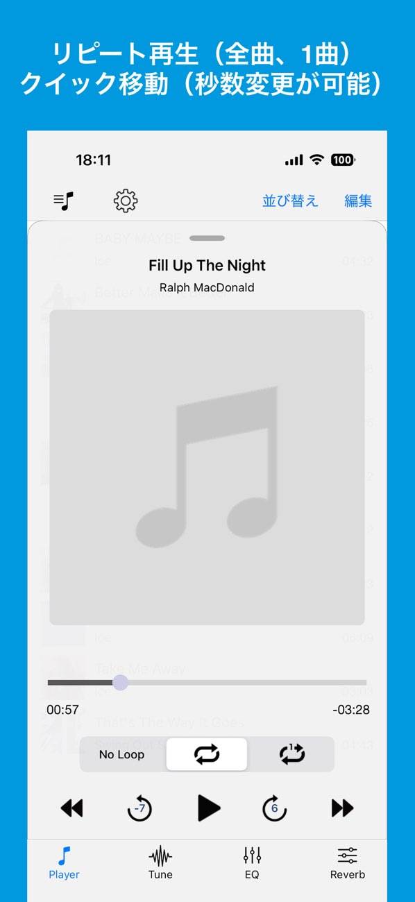 再生位置のスキップやリピート再生で、聴きたいところだけを聴けます。スキップは5秒や30秒など固定の秒数を設定でき、スムーズに再生位置を変更可能です。リピートは全曲を再生し終わったら最初に戻るか、1曲だけを再生し続けるかを選べます。