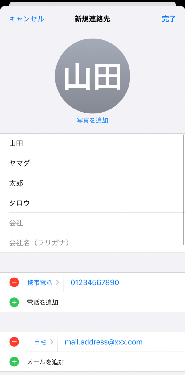 名前や電話番号、メールアドレスなど、連絡先の情報を入力します。完了したら右上の「完了」をタップします。