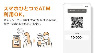 QRコードを読み取らせるだけでATMが使用可能に。本アプリはキャッシュカードの代わりとしても使えます。対象のATMはセブン銀行ATMとローソン銀行ATM。財布を忘れてしまった人や、そもそもカードを持ち歩きたくない人におすすめの機能です。