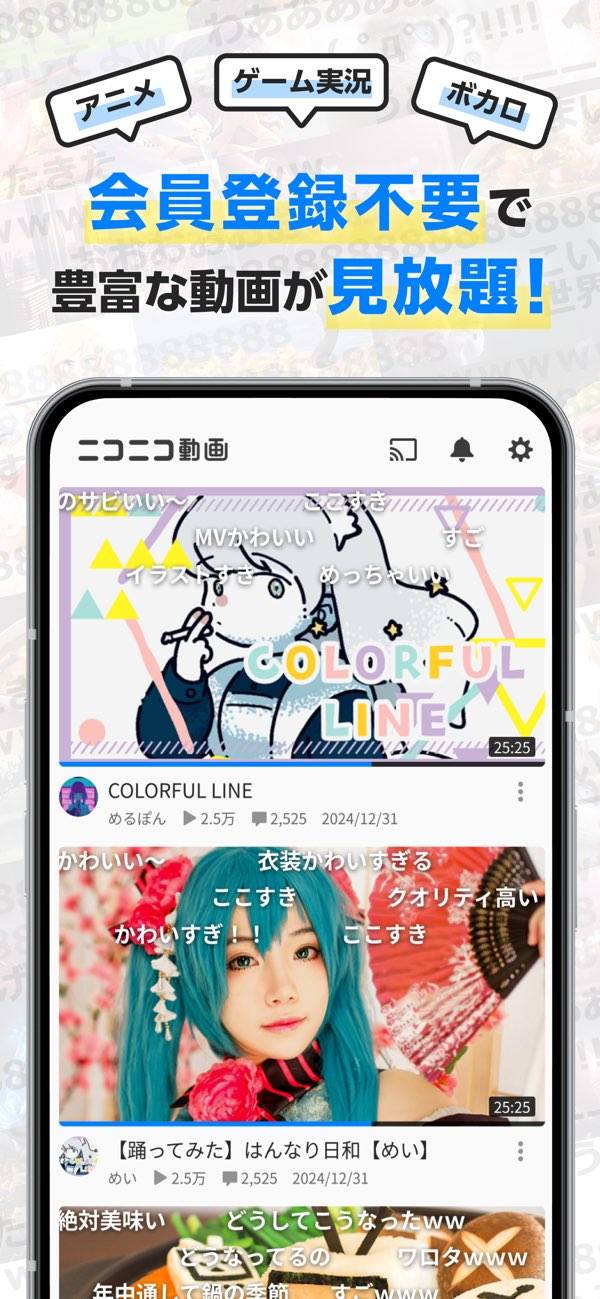 弾幕のように流れるコメントが特徴的。コメントは誰でも気軽に投稿できます。また表示位置やフォントカラーなどは自由に設定可能。1人ひとりのコメントが動画を、さらに盛り上げていきます。動画を視聴して、コメントを残すことで、一体感を感じられるのが本アプリならではの魅力のひとつ。