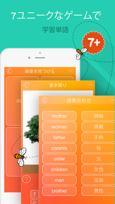 単語学習をさらに楽しむためのゲームが豊富。絵探しや単語マッチなど、単調になりがちな単語学習も飽きずに続けられます。学習した単語の復習も簡単にでき、記憶に定着しやすいです。