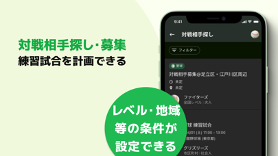 場所や費用、募集期限などを入力するだけで対戦相手の募集が出せます。近くで練習相手を募集しているチームがないか検索も可能。相手のチームのレベルもわかるので、お互い高め合える相手と出会えます。
