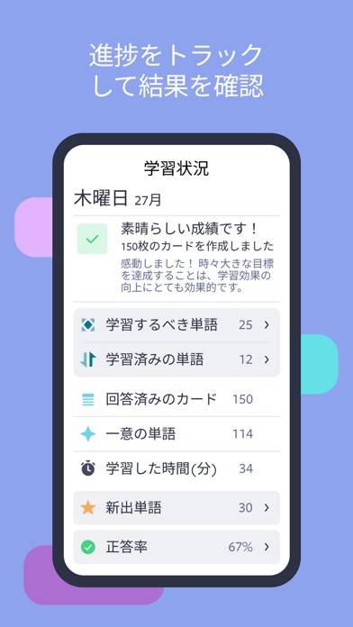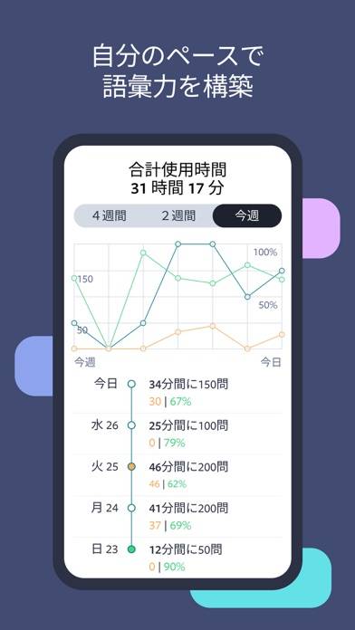 学習の記録が自動でカレンダーに表示されます。学習時間、回答した単語の数などがわかります。毎日の目標が設定されているので学習意欲を維持。学習継続日数もカウントされるので毎日学習するモチベーションにつながります。
