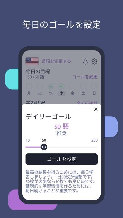 学習の記録が自動でカレンダーに表示されます。学習時間、回答した単語の数などがわかります。毎日の目標が設定されているので学習意欲を維持。学習継続日数もカウントされるので毎日学習するモチベーションにつながります。