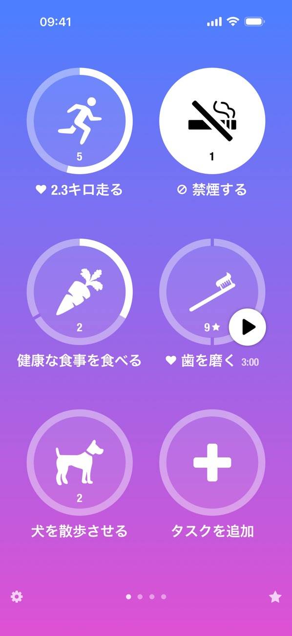毎日やるべきことや習慣づけたいことを登録し、管理できるアプリ。達成したか否かや進捗を、画面に並んだアイコンで見やすくチェックできます。一画面でまとめて情報を確認できるほか、ページを切り替えられるので、たくさん登録しても見づらくなりません。