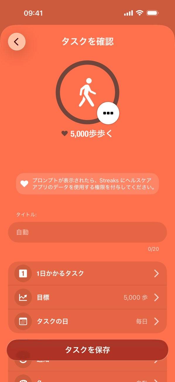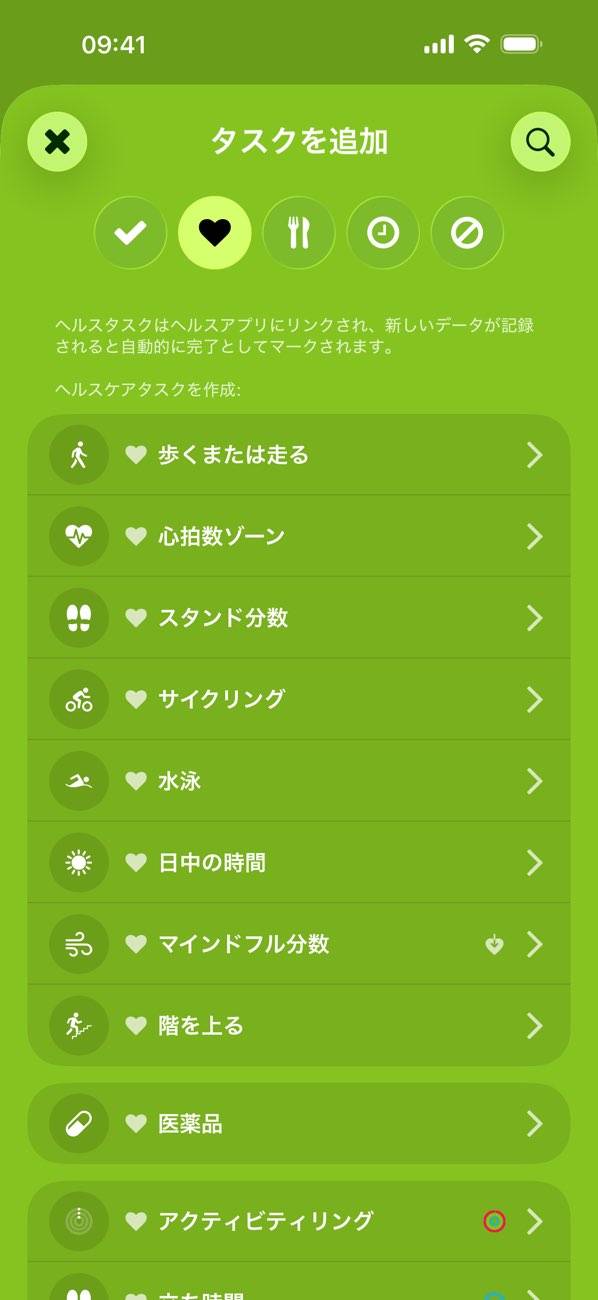 タスクの間隔や1回あたりの目標時間など、細かに項目を設定できます。タスクの内容に応じて、柔軟に使用感をカスタマイズできるでしょう。運動をはじめヘルスケア系の項目の場合は、スマホと連携して自動で記録も可能です。