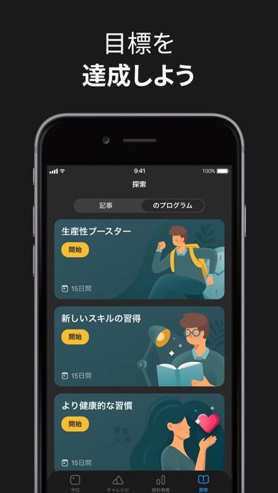 「読書する」「オンラインで勉強」などさまざまな習慣を用意。当てはまるものが無いときは、自分で作ることもできます。健康改善、運動不足の解消など、幅広い目的で使えるでしょう。