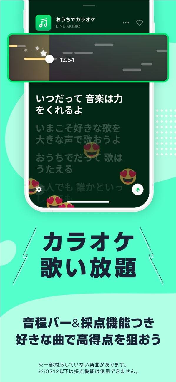 歌詞表示やプレイリスト作成、MV視聴に加え、採点付きのカラオケ機能やLINEスタンプの使い放題なども利用可能。