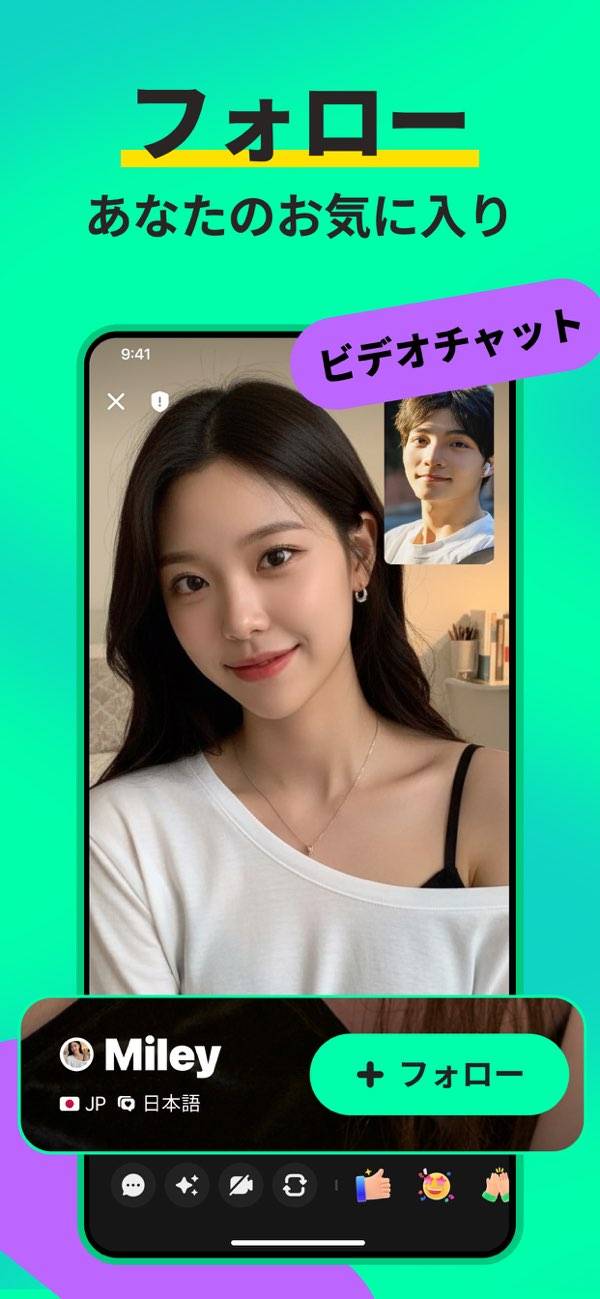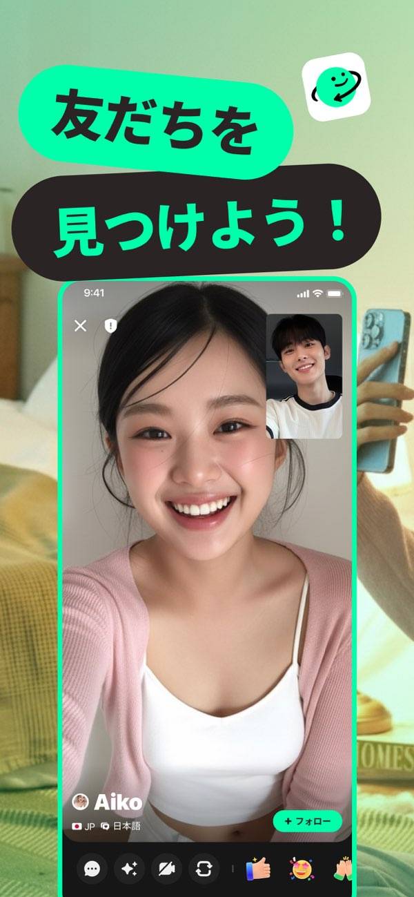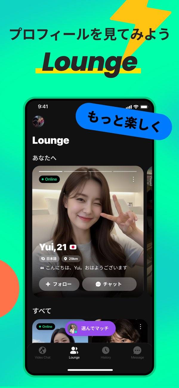 驚くほどの手軽さで、国内外のユーザーとビデオチャットできます。アプリを開いてサッと左にスワイプするだけで、自動でマッチング。海外の利用者が多いですが、国フィルターで日本人同士の交流も可能のため、外国語が苦手な方も安心です。さらにライブ配信の視聴や配信もでき、多彩な交流スタイルを楽しめます。