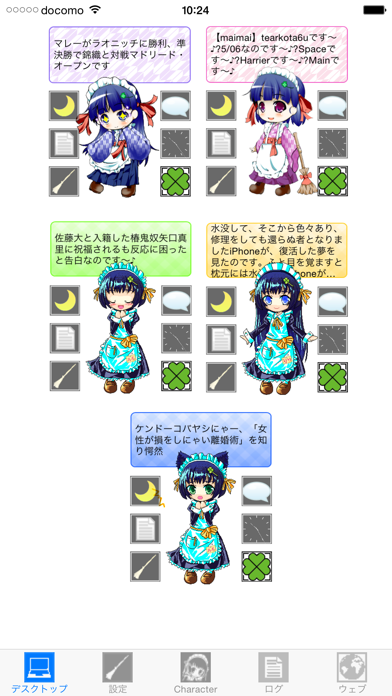ニュース情報をキャラが楽しく伝えてくれるアプリです。画面上に配置した可愛いキャラクターが、最新のニュースやTwitterのタイムラインの情報をおしゃべりしながら伝えてくれます。キャラクターは自由にカスタマイズ可能で、おしゃべり内容に応じて表情も変化しますよ。
