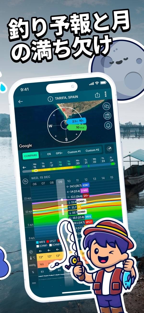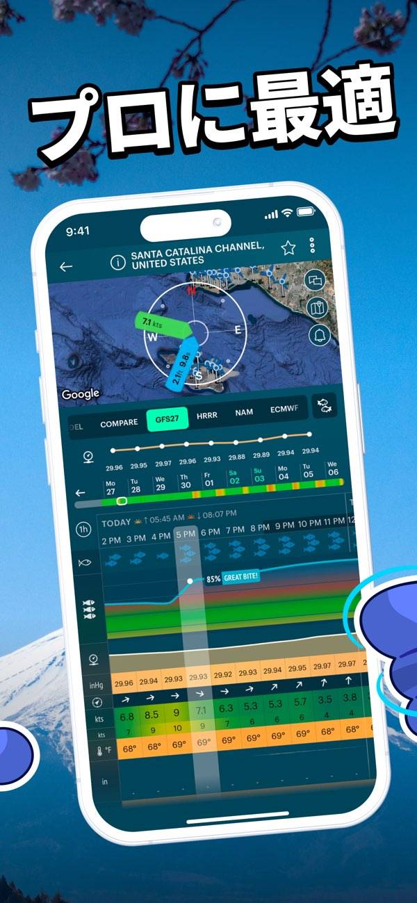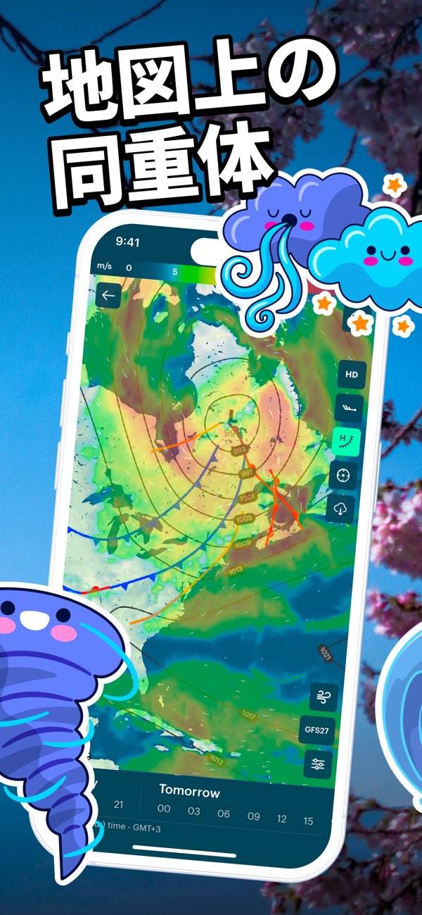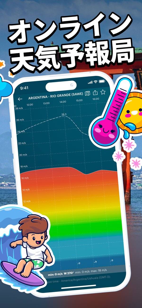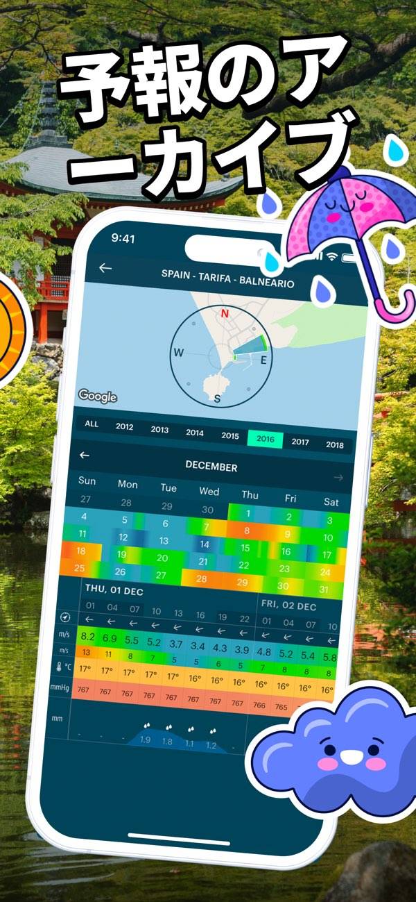 風量や風向き、波の高さなど細かい天候をいち早く知れる天気アプリ。位置情報を送信することで、付近の天気や風量、大気圧などの情報が3時間ごとに表示されます。サーフィンや釣りに行く前にチェックしておいてください。