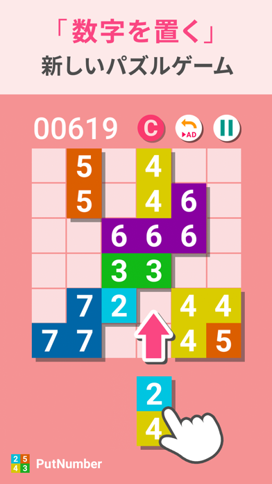 数字のブロックをボード上の好きな場所に配置します。ブロックはタップで回転も可能。「3」のブロックを3つ並べるなど、書かれた数字以上のブロックをつなげると消すことができます。ボードにブロックを置けるスペースがなくなるとゲームオーバーです。