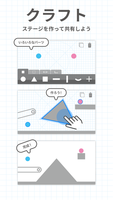 特徴的なのが「自分で答えを描く」というシステム。指でさまざまな形を描き、ボール同士をくっつけていきます。物理演算を用いているので、正解は何通りもありますよ。