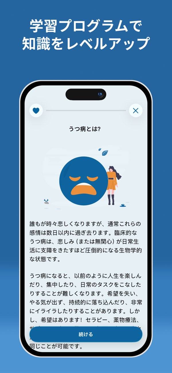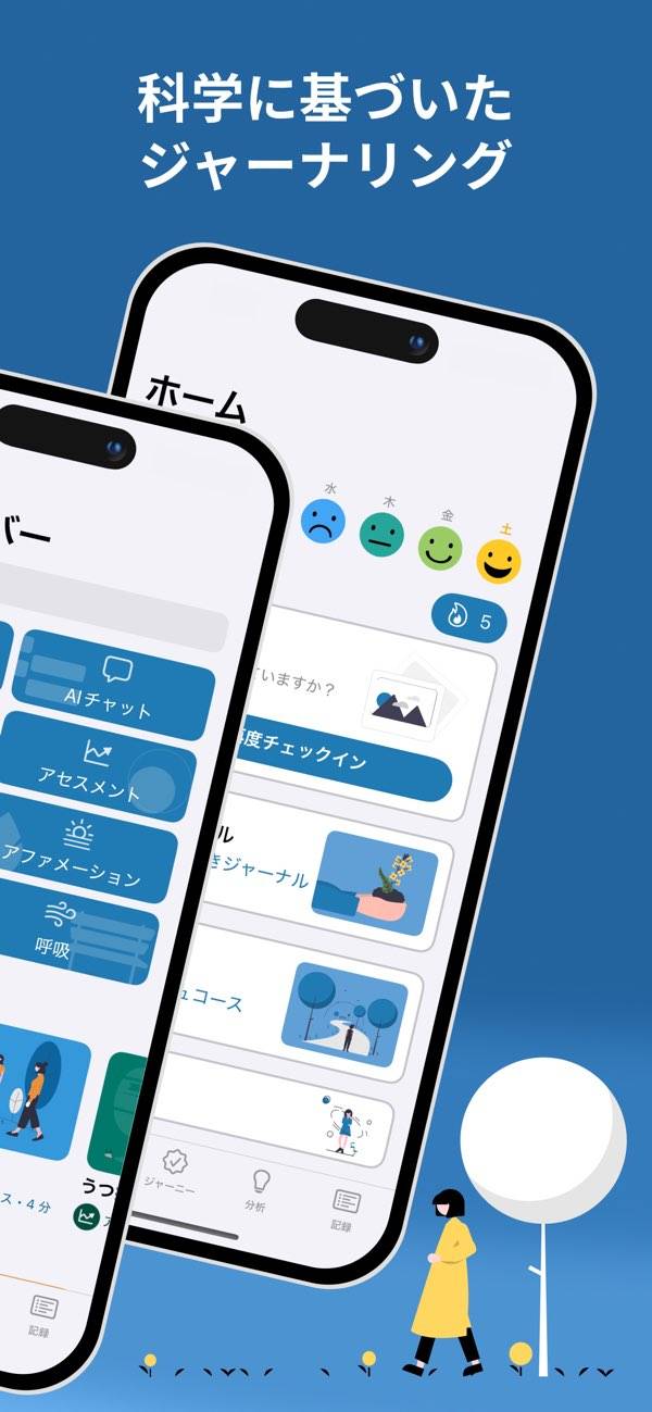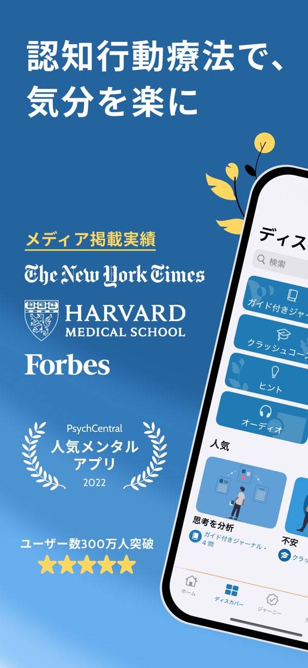 毎日の気持ちを記録して、自分の心と向き合う思考日記アプリです。ただ感情を記録をするだけでなく、認知行動療法やポジティブ心理学などで使われているツールを利用できるのが大きな特徴。