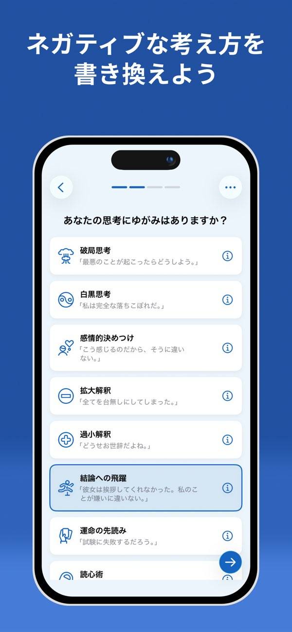 どうしてそう思ったかなどの思考の分析が手軽にできます。客観的に自分の思考を分析することで、思考のパターンやかたよりに気がつけます。自分の思考を把握することは、気持ちを楽に保つための第一歩となるでしょう。