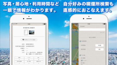 - 喫煙所の設備・感想が書ける。お気に入りの喫煙スポットが見つかる