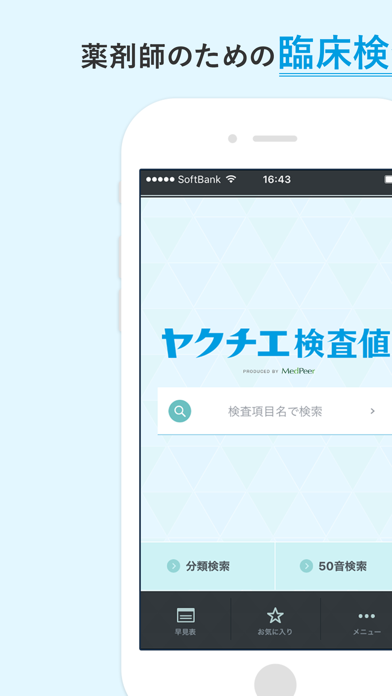 臨床検査項目を詳細に解説するツール。1,166項目の略語、測定法、基準値から対処法まで詳細にわかります。さらに、フリーワードや50音、分類から検索でき、必要な情報をすぐに見つけられます。お気に入りの項目はラベル分けして保存可能。