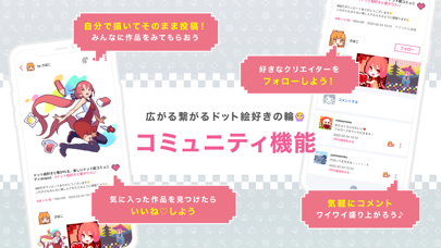 ほかユーザーが描いた絵を見て、イラスト制作の参考にできます。ドット絵の線は独特なので、バランスよく描ける方法がわからないことも多いでしょう。初心者はほかの絵を見ながら描いてみるのもおすすめです。