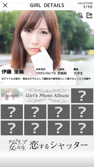 カメラアプリ感覚でシャッターを切ると美少女が写り込むゲーム。『タイムスリップ女子高生』公式アプリで、出演しているモデルのプロフィールなどが見られます。