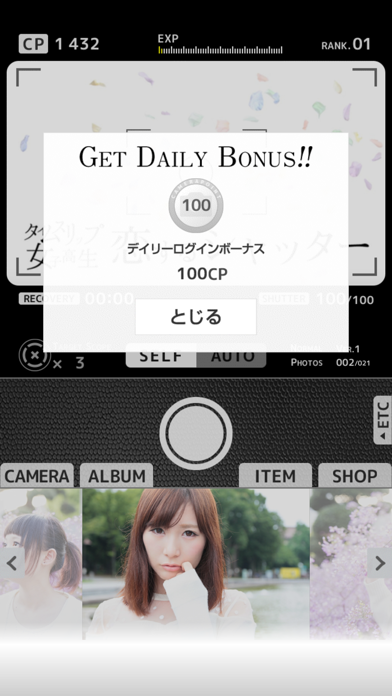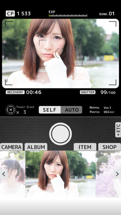 クリッカーゲームに近い操作で、どんどんシャッターボタンを押して写真を集めます。風景などが写ったハズレ写真がほとんどですが、たまにモデルの写真が出現。彼女たちのプロフィールとさまざまな表情を楽しめます。