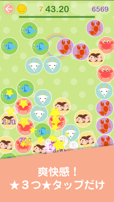 ▲12星座がかわいいイラストで描かれ、画面中にぎっしり。3つ以上連なっている部分をタップして消していこう。