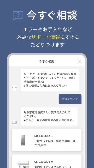 このアプリではチャットを使って簡単にサポートを受けられます。選択肢をタップするだけでなく音声入力もできるから、必要な情報を手早くゲットできます。家電のトラブルを手軽に質問できるツールが手元にあるだけで、かなりの安心感を得られますね。