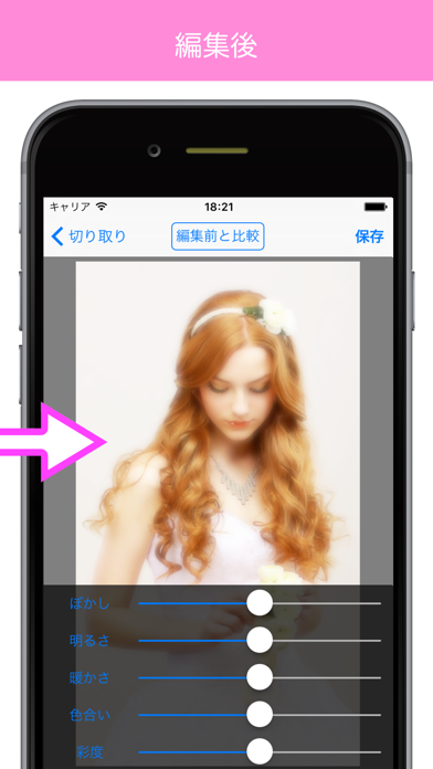 写真全体に淡くぼかし加工をかけられるアプリです。写真を選んで、ぼかしの強さや写真の明るさなどを調整するだけ。細かいシミやホクロもぼかして隠せちゃうので、自撮り写真におすすめです。