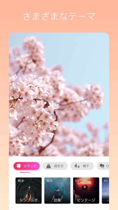 使用する画像や動画などを選ぶだけで、クオリティの高いスライドショーが作成できます。「Vlog」「Family」など便利なテーマを収録しているのも特徴。画像ごとに背景のぼかしを強くしたり、BGMを変えたりと自分好みに調整もできます。