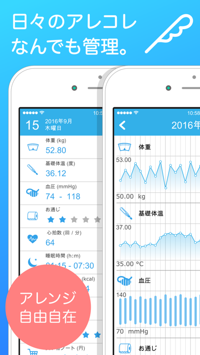 その日の体調の記録を簡単に残せます。折れ線グラフで前日などと比較を出来ることもできます。日々の体調管理は大切なので重宝してます。