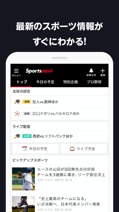 もう複数のスポーツアプリを使い分ける必要はありません。プロ野球・MLB・Jリーグ・海外サッカー・Bリーグなど、あらゆるスポーツの最新ニュース・試合結果などをチェック可能。注目の試合やニュースがトップに表示され、直近24時間の重要な話題も見逃しません。