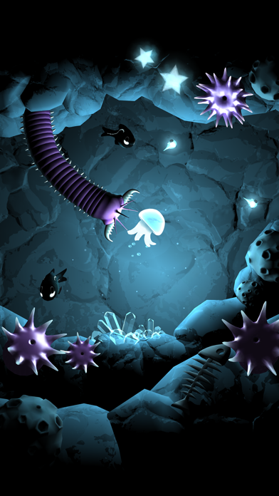 本アプリは、深海に棲むクラゲを操作して、プランクトンを食べながらなるべく長く生存するアクションゲーム。暗闇にまばゆい光を放つクラゲが、とても幻想的。