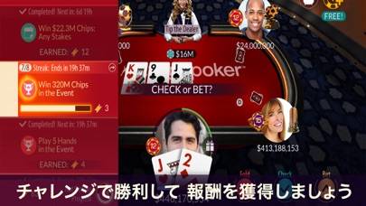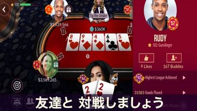 テキサスホールデムを遊ぶことができる 人数も多くいるためいつでも対戦相手に困ることはなく、様々な額のテーブルが用意されているためチップが少なくても十分に遊べる また、無料でも毎日大量とはいかなくとも一定以上のチップがもらえるため課金の必要もなし さらに普通のテーブルだけでなく3人から優勝者のみが賞金を得られるモードや、10人からtop3が賞金を得られるモードなどが常設されている もちろんこれらも人がいるため長時間待つことは少ない そして最近ではハロウィンなどイベントのテーブルも期間限定で楽しめる 強いて悪い点を言うならばテーブルを離れたときに5秒のcmが流れること しかしこれも長時間一つのテーブルについて遊ぶポーカーではあまり気にならないか