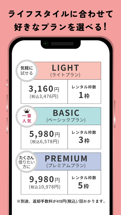 「新品の洋服を定額で試せる」これがこのアプリの特徴。毎月一定の料金を支払うことで、新しい洋服を好きなだけ借りることが可能です。何着借りても追加料金なし。新しい洋服を常に着たい方や、高価なフォーマルアイテムなどもレンタルできます。