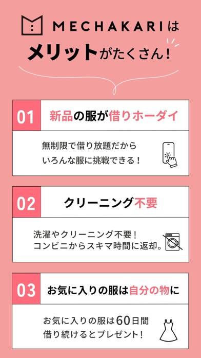 「新品の洋服を定額で試せる」これがこのアプリの特徴。毎月一定の料金を支払うことで、新しい洋服を好きなだけ借りることが可能です。何着借りても追加料金なし。新しい洋服を常に着たい方や、高価なフォーマルアイテムなどもレンタルできます。