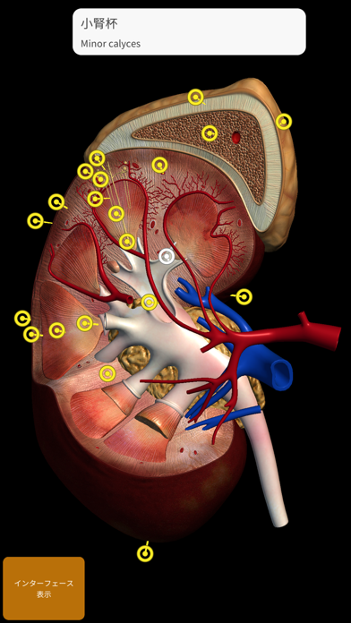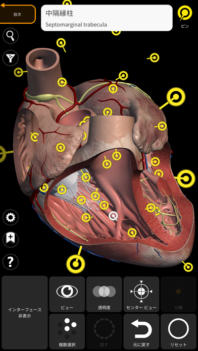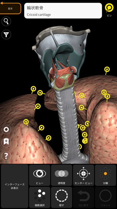 タップすると部位ごとの名前が書かれたピンが現れます。ピンをタップすると画面上部に名前が表示。医療学生・医療従事者なら、部位を暗記するときに役立ちそうな機能です。