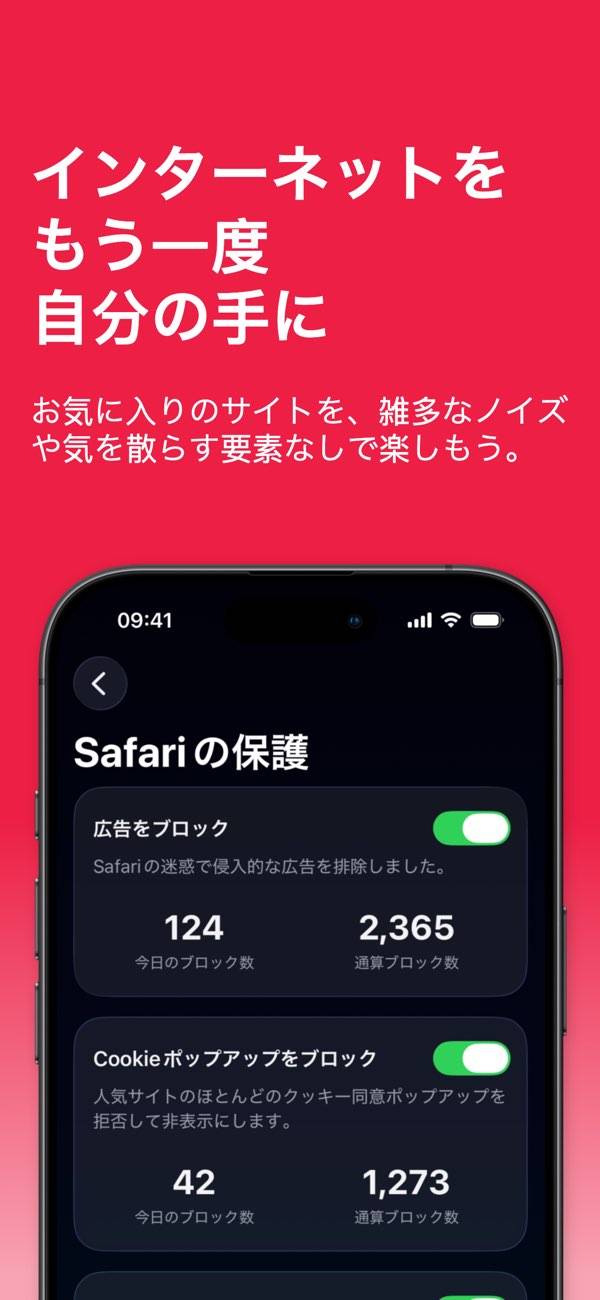Webブラウザ『Safari』に表示される広告をブロックするアプリです。広告を非表示にすれば、トラッキング行為やウイルス感染を防げます。またスマホのデータとバッテリーを節約したい人にもおすすめ。