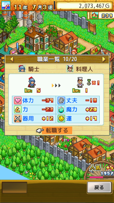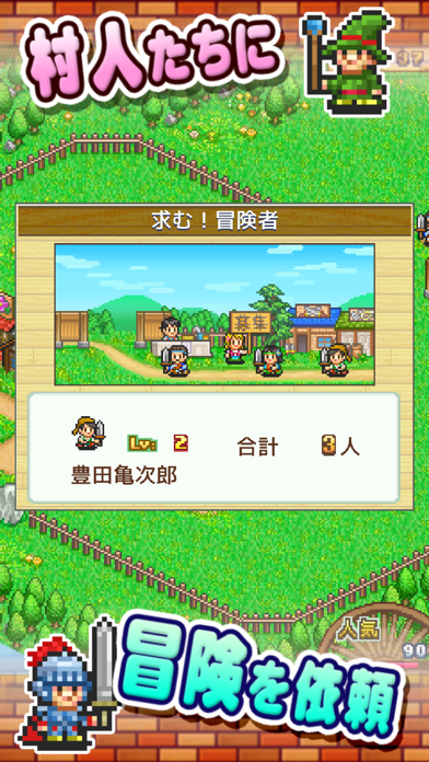 村の人気が高くなれば冒険者がマイホームを建てて永住してくれます。「道場」「魔法研究所」などを建築して街の人気を高めれば、多くの冒険者で賑わいます。