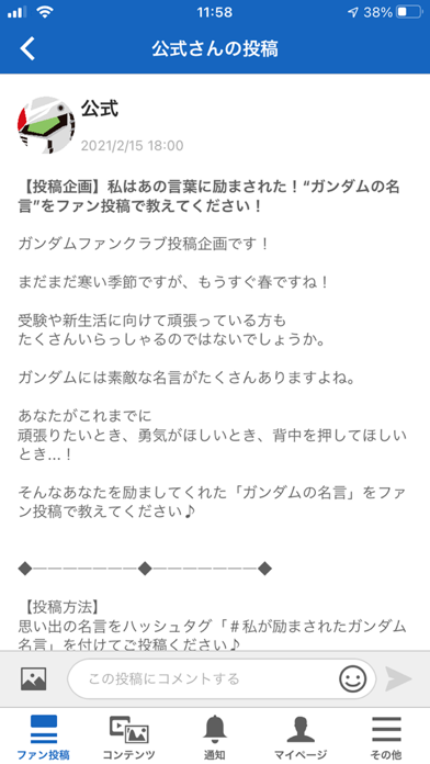 ファンや公式からの投稿を見られるタイムライン画面で、交流も楽しめます。アニメの感想はもちろん、作ったガンプラの写真など、各ユーザーが思い思いのガンダム愛を語っています。お互いに作品への情熱を発信してみましょう。