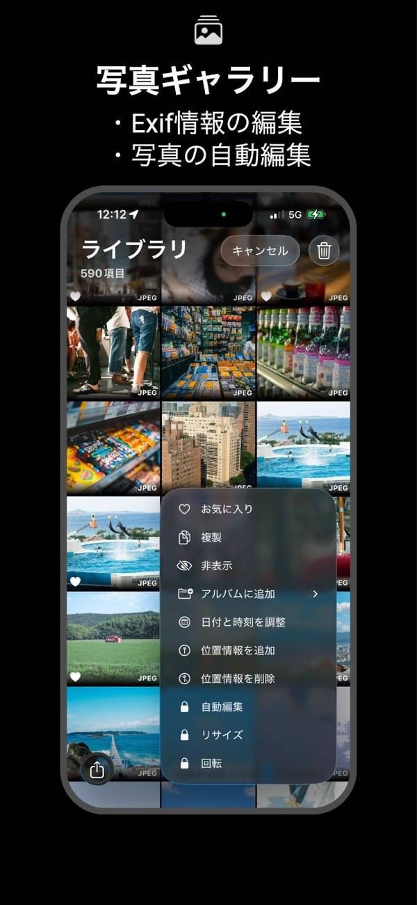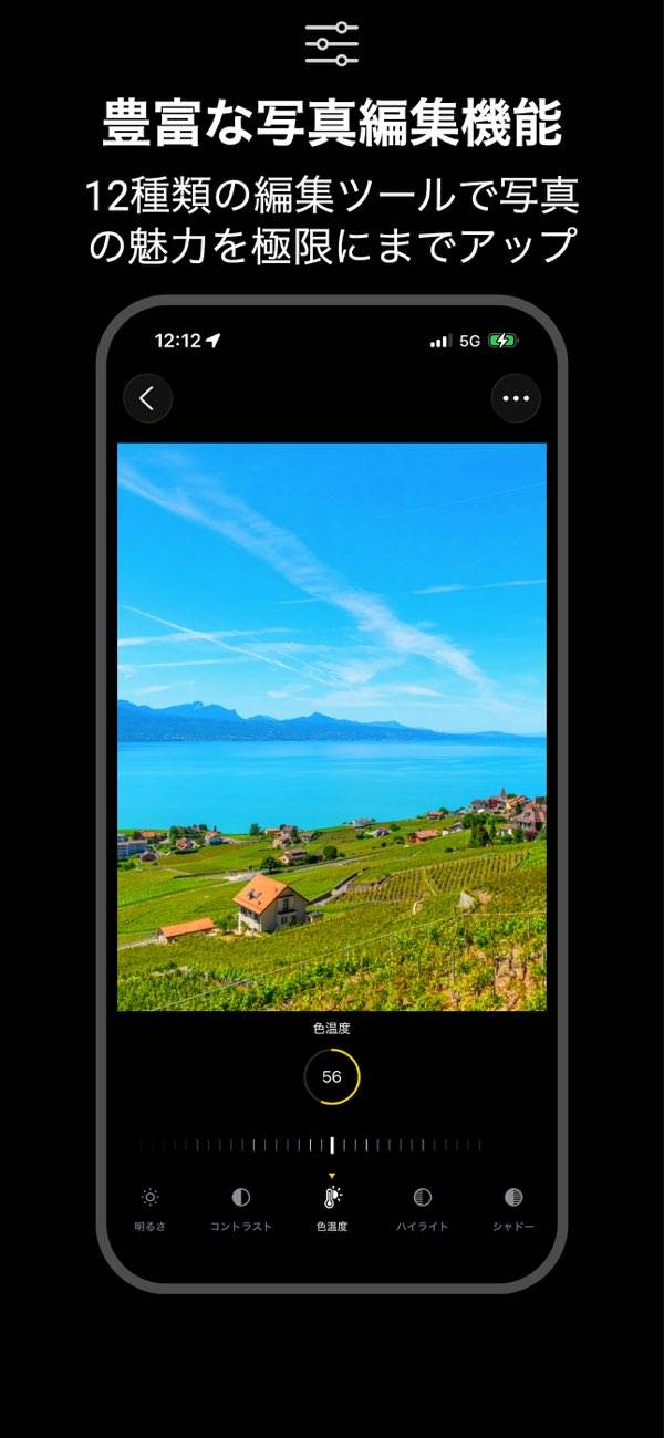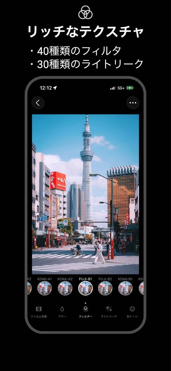 明るさやコントラスト、色温度、ハイライト・シャドーといった基本調整に加えて、フィルム効果やブラー、40種類以上のフィルター、30種類以上のライトリークなども搭載。撮影後にギャラリーで写真を開き、好みの効果を足していく流れで進められるため、編集が苦手でも雰囲気づくりを楽しめます。撮ったその場で仕上げられるので、スムーズに投稿できるでしょう。