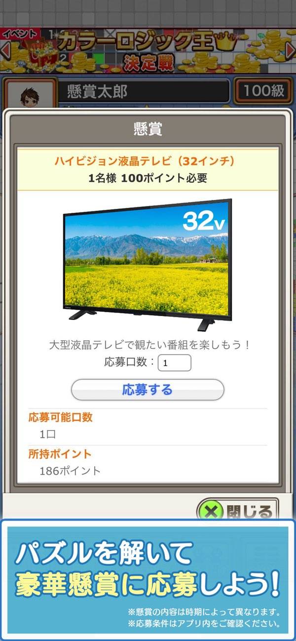 パズルをクリアして、懸賞ポイントをGETしましょう。ポイントを使うと、最新家電やゲーム機が当たる懸賞に応募が可能。応募期間は、毎月1日から末日までの1か月間です。当選者は毎月10日に、サイト内の「当選結果発表」で通知されます。