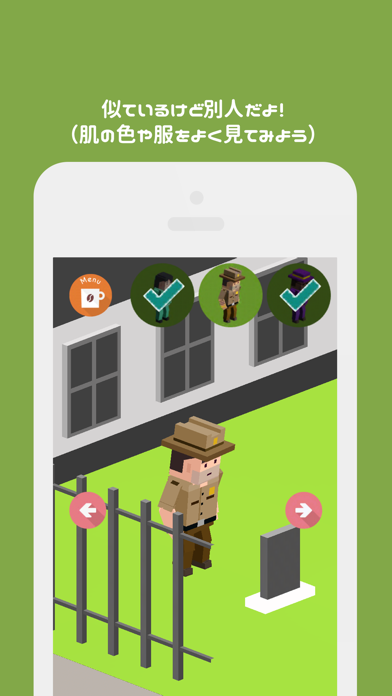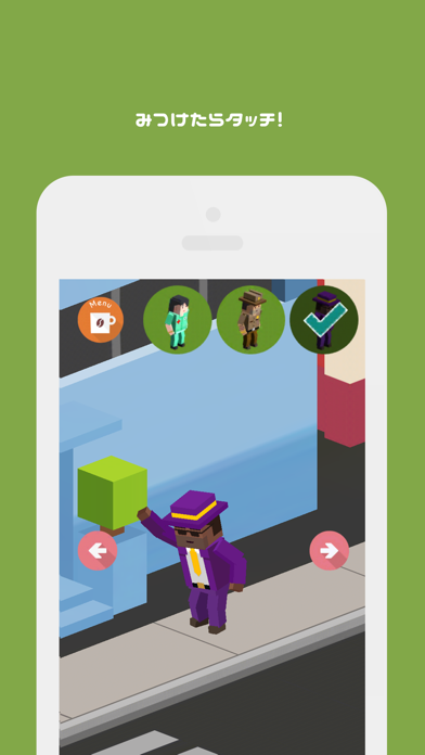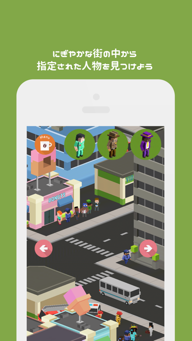 本作は街の中から、指定された人を探し出すゲーム……ですが、なんとターゲットはもちろん、街の人は止まることを知りません。つい1分前に見た場所も、再び見れば違う人だらけ。つい何度も同じ人をタップしてしまうほど、頭はパニック状態に追い込まれてしまいます。