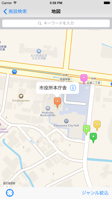 このアプリを使えば、金沢市内のさまざまな施設を簡単に検索できます。文化施設や避難場所など、地図上やジャンル、キーワードから目的の施設を探せます。これにより、市民や観光客は生活や旅行で必要な施設を手早く見つけることができます。