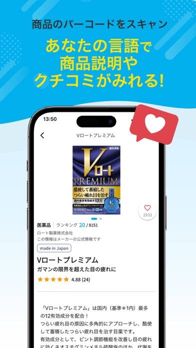 買い物中に商品のバーコードを読み取ると、原材料名や口コミ情報が表示されます。成分一覧や使い方、注意点なども確認できるので、アレルギーや宗教的な制約がある人でも安心。アプリの設定から言語表示を変えると、中国語や韓国語、ベトナム語に変更が可能です。