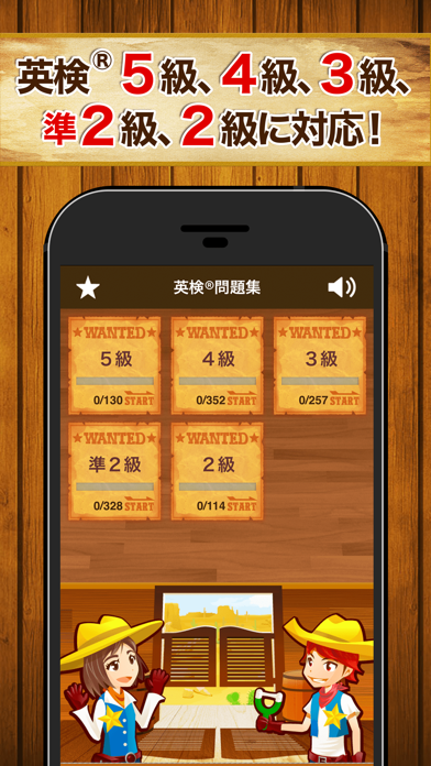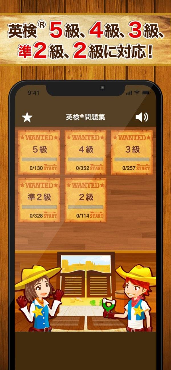 - 西部劇風のキャラクターや演出、レベルアップで楽しく学習できる