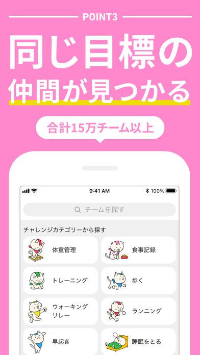 あなたが目指す目標に合わせて、30種類以上のチャレンジから選べます。また、自分で新しいチームを作ることも可能です。自分に合ったチームメイトと一緒に目標を目指すことで、効率的に達成へと進めますよ。